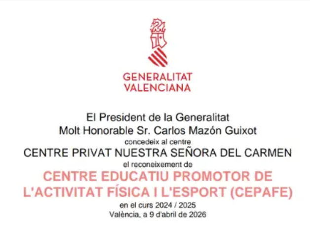 Un curso más, la Conselleria de Eduación certifica a nuestro colegio como Centro CEPAFE (Centre Educatiu Promotor de l’Activitat Física i l’Esport), consolidando su compromiso con la promoción de la actividad física y la salud. Este distintivo avala el trabajo constante del equipo educativo en la mejora de hábitos saludables y la calidad de vida del alumnado a través del deporte.