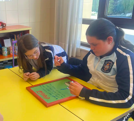 Los alumnos y las alumnas de cuarto de primaria aprenden preposiciones, conjunciones, abreviaturas etc jugando de forma cooperativa con diferentes retos utilizando las pizarras.